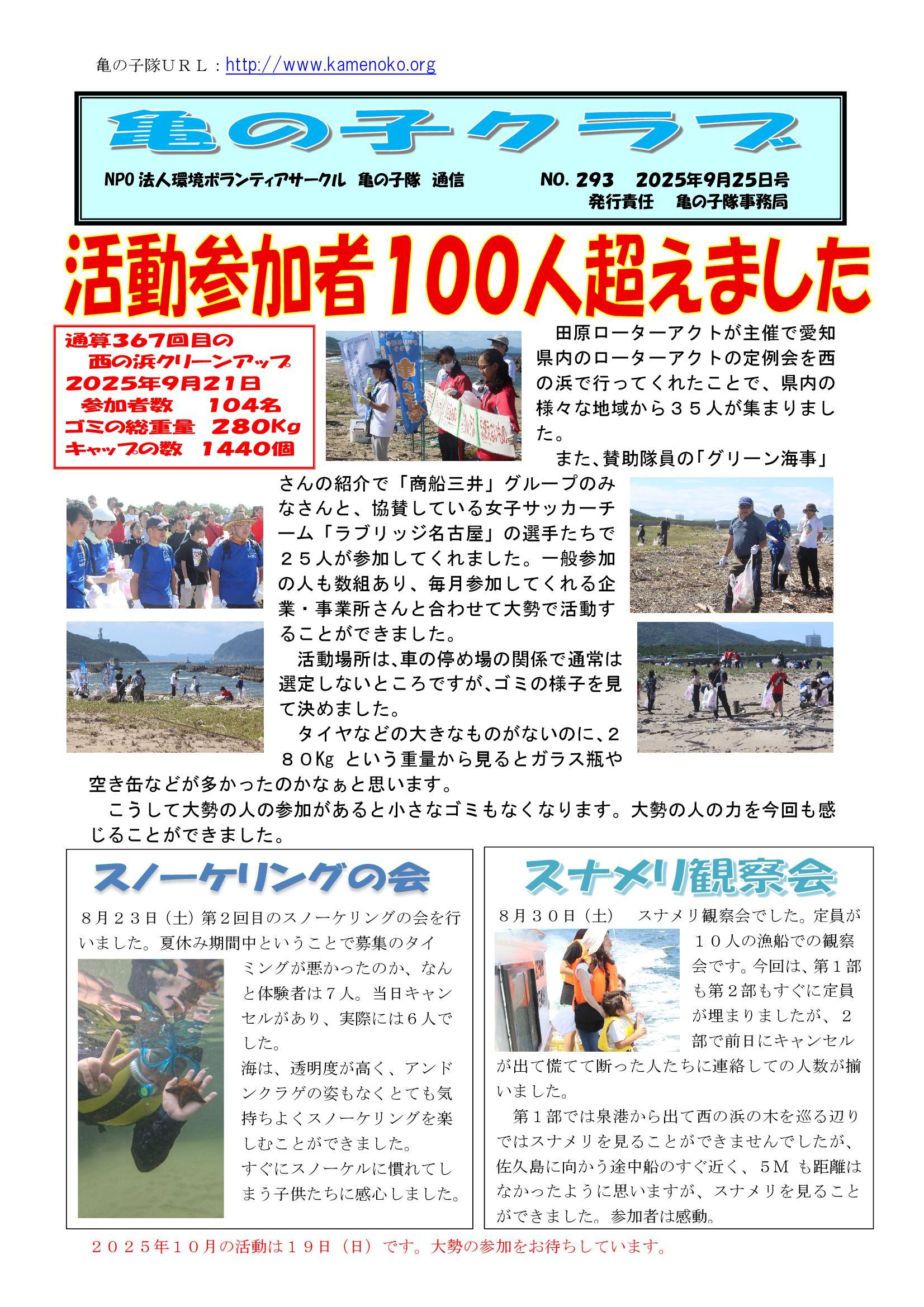 活動参加者100人超えました 「田原ローターアクトが主催で愛知県内のローターアクトの定例会を西の浜で行ってくれたことで、県内の様々な地域から35人が集まりました。・・・」続きは亀の子クラブで