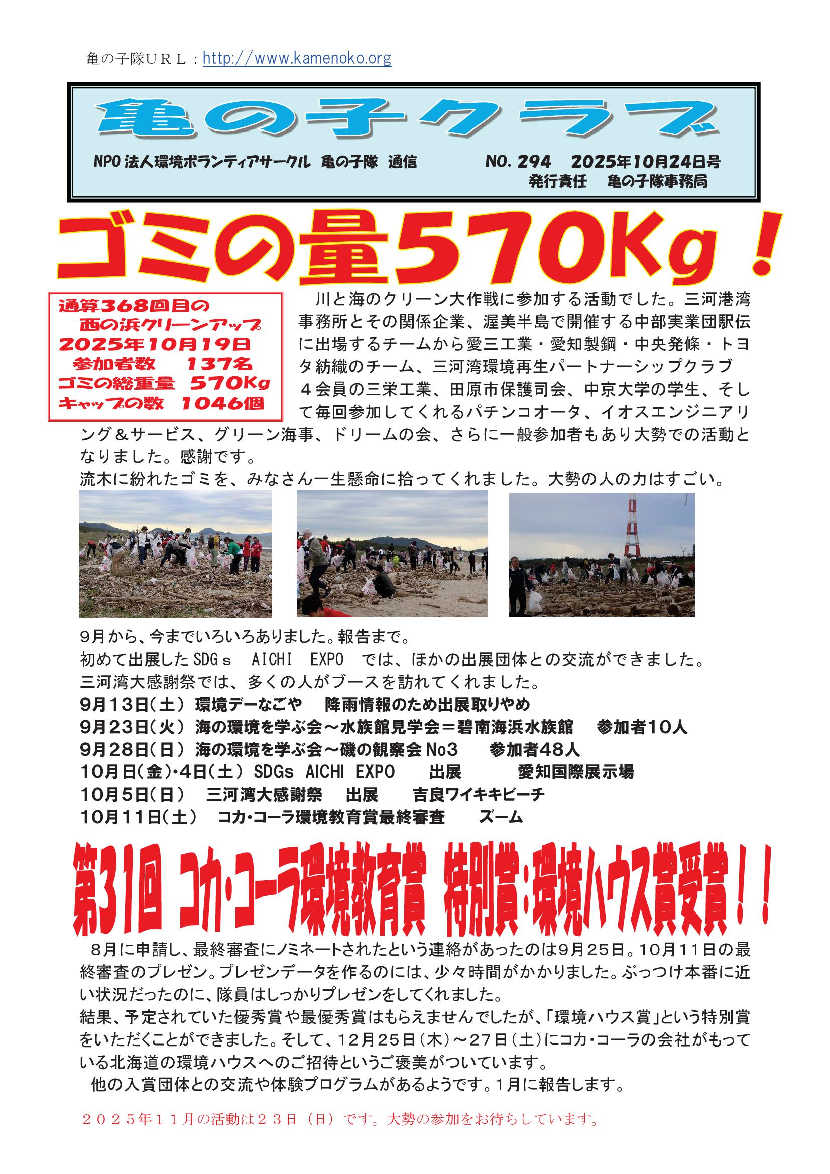 ゴミの量570kg! 「川と海のクリーン大作戦に参加する活動でした。三河港湾事務所とその関係企業、渥美半島で開催する中部実業団駅伝に出場する・・・」続きは亀の子クラブで