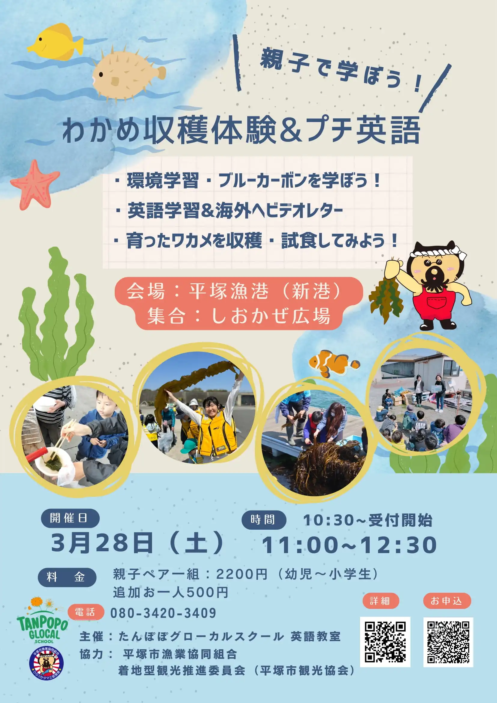 - 概 要 平塚漁港にてわかめの収獲体験とブルーカーボンSDGsの取り組みを学び、英語学習も行います。英語を楽しみながら、地球環境の大切さと、平塚の海の魅力を学びましょう!活動の様子をビデオに収めて海外の学校へ配信♪